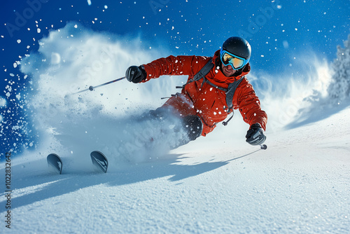 A skier dynamically descends a ski slope.