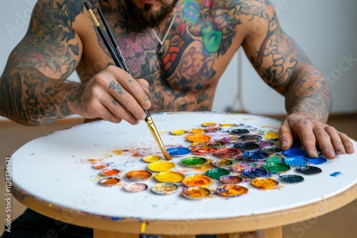 A skilled artist working on a large canvas, with a palette of vibrant paints and brushes in their hand