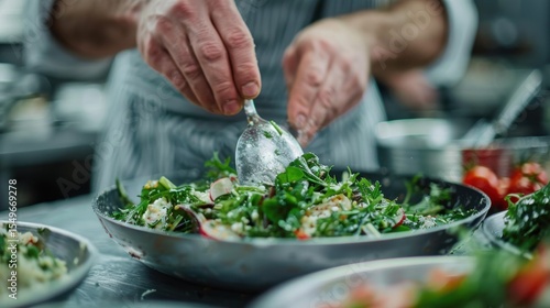 A skilled chef is seen meticulously preparing a vibrant salad filled with greens and colorful vegetables, emphasizing freshness and culinary artistry in a bustling kitchen.
