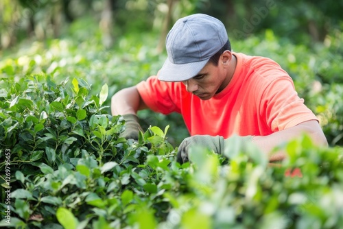 A skilled landscape contractor carefully trims bushes while kneeling in a vibrant, green garden under natural light