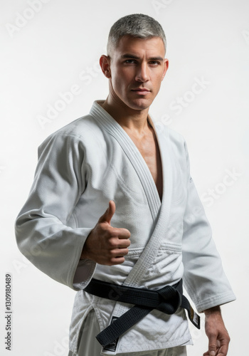 A skilled martial artist poses confidently in a karate training studio while wearing a traditional uniform and black belt.