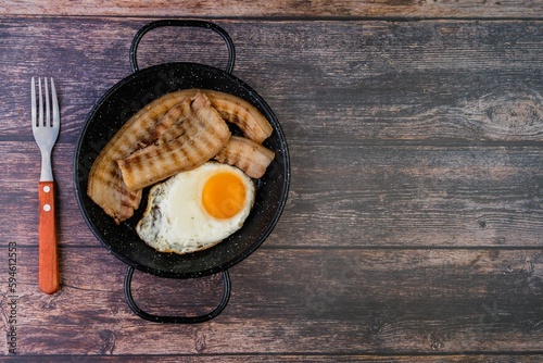 a skillet with eggs, bacon, bread, toast, and fork on a