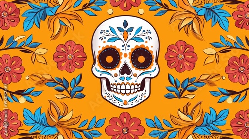 a skull with flowers on an orange background