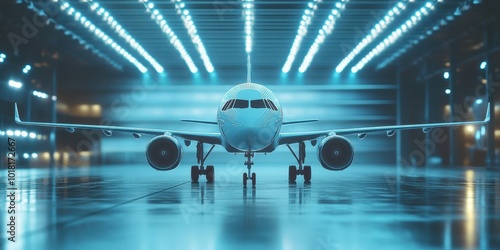 A sleek aircraft positioned in a modern hangar, illuminated by soft blue lights, showcasing an innovative aviation environment.