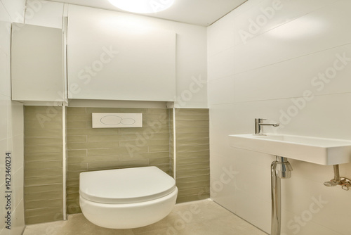 A sleek and minimalistic bathroom featuring clean lines, a wall-mounted toilet, and a compact sink. The light color palette enhances the spacious look.