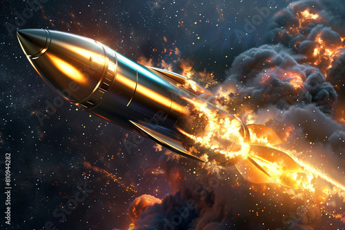A sleek and shiny rocket with golden accents blasting off with a trail of fiery exhaust octane render