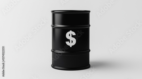 A sleek black oil barrel featuring a prominent dollar sign, symbolizing the connection between oil prices and the economy. Ideal for finance and energy-related themes.