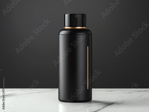 A sleek black perm spray can, glowing softly on a marble countertop with dramatic studio lighting