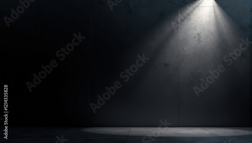 A sleek black wall, segmented into four vertical squares, under the dramatic glow of a spotlight. Shadow dances across the floor, creating a captivating interplay of light and dark