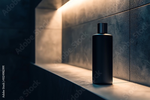 A sleek, dark bottle sits elegantly on a modern shelf, illuminated by soft lighting, creating a minimalist and tranquil atmosphere.