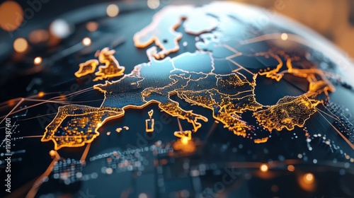 A sleek, futuristic 3D virtual globe with glowing points of digital pic