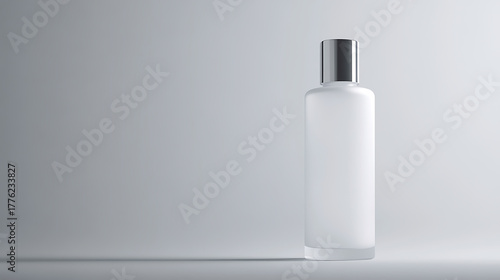 A sleek, minimalist bottle with a silver cap sits on a light gray surface. The frosted glass adds a touch of elegance and sophistication. Perfect for showcasing cosmetic products.
