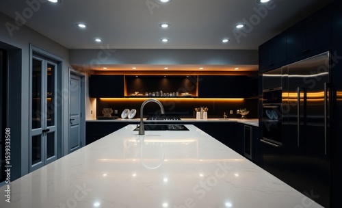 A sleek modern kitchen where a glossy island-like countertop crafted from gleaming quartz commanded attention its surface reflecting the warm glow of recessed lighting