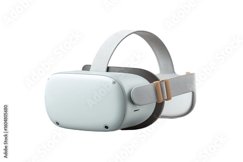 A sleek, modern virtual reality headset with adjustable fabric straps and a smooth white front panel designed for immersive digital experiences.