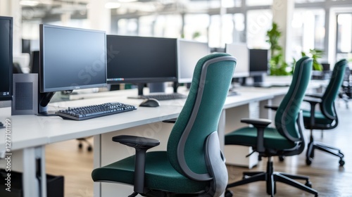 A sleek office desk features two computer monitors, showcasing a modern workspace ideal for productivity and multitasking.