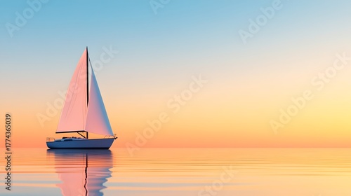 A sleek sailboat glides across a serene lake its reflection mirroring the vibrant orange and yellow sunset sky