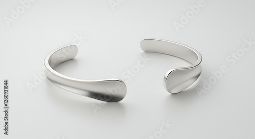 A sleek silver cuff bracelet with a modern, open-ended design, resting on a white setting.