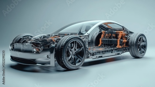 A sleek, silver electric car is meticulously deconstructed in a 3D rendering, revealing the intricate internal workings of its electric powertrain.