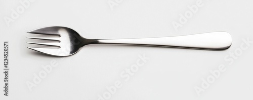 A sleek silver fork rests on a light gray background, showcasing its polished surface and simple design.