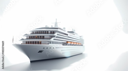 A sleek white cruise ship with multiple decks and a prominent bow, isolated against a stark white background
