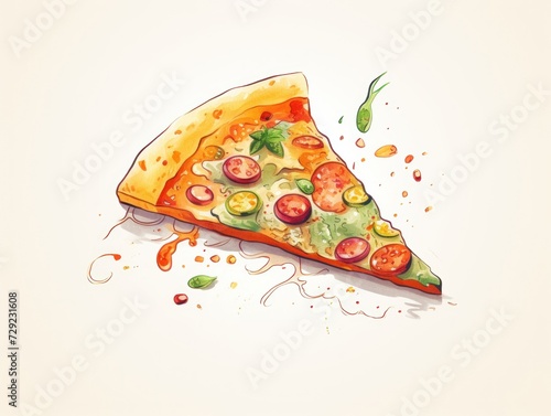 A Slice of Pizza With Various Toppings. Watercolor illustration.