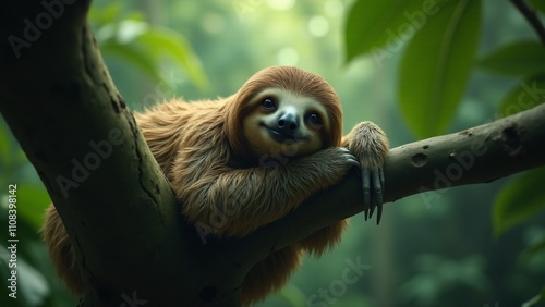 A sloth rests lazily on a tree branch, its body relaxed and limbs hanging loosely. The vibrant green rainforest provides a tranquil backdrop, with soft light filtering through the leaves.