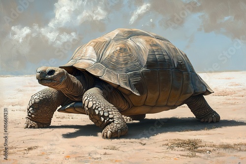 A slow-moving giant tortoise with a large, weathered shell slowly making its way across the ground