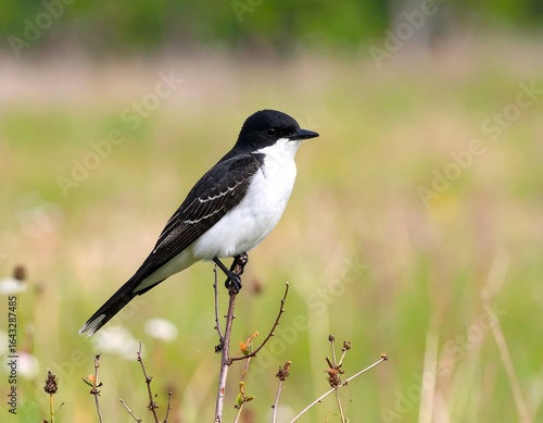 A small bird perches on a twig in a field