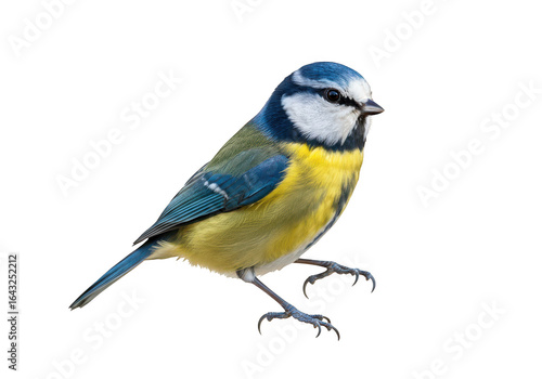 A small blue tit bird with yellow and green feathers, perched on an invisible branch, isolated on transparent background