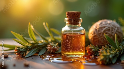 A small bottle of amber essential oil sits on a wooden surface, surrounded by green plants and a soft, beige ball. Golden sunlight highlights the scene, creating a warm and inviting atmosphere.