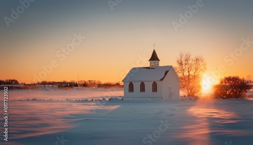 A small church in the middle of a frozen field, its windows glowing with the light of a winter sunrise as snow blankets the surrounding land.