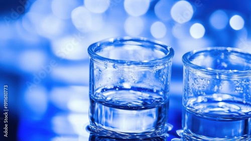 A small, clear glass beaker, filled with a transparent liquid, stands in a modern laboratory setting with a beautiful blue bokeh background, ideal for scientific research.