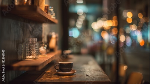 A small cup of coffee sits on a wooden table at a cafe. The background glows with warm lights from a bustling street creating a cozy atmosphere during evening hours.
