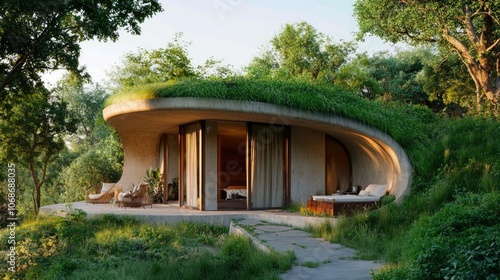 A small, eco-friendly underground house with a natural, earth-covered roof, showcasing a harmonious relationship with nature and a sustainable lifestyle.