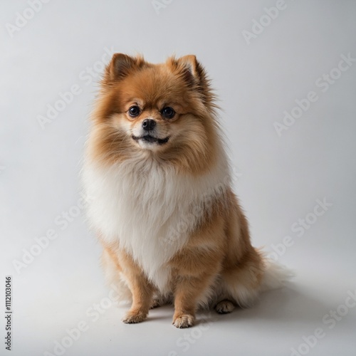 A small, fluffy Pomeranian dog looking curiously on a white background.
