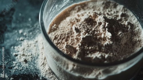 A small glass dish containing dark brown powder with larger particles on top. Powder is spilled onto a wooden surface.