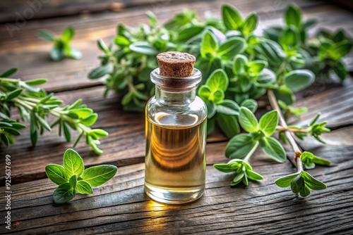 A small glass vial filled with oregano essential oil sits on a rustic wooden table surrounded by fresh oregano leaves and a few sprigs of rosemary.