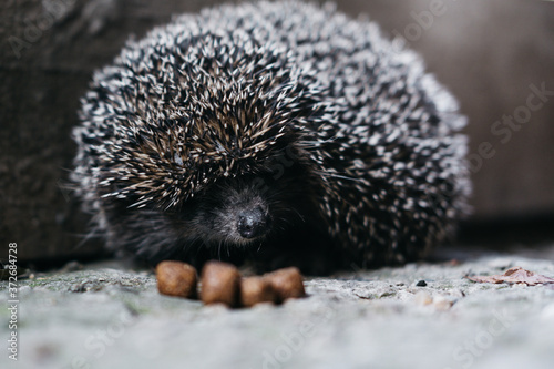 A small gray charming prickly hedgehog showed its sharp muzzle. Curious forest dweller in the light of day, hedgehog. A long-eared spiny rat, a predatory little wild animal.