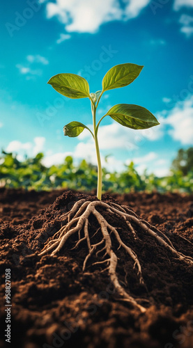 A small green sprout grows from the soil, with deep roots and strong stems visible below it.