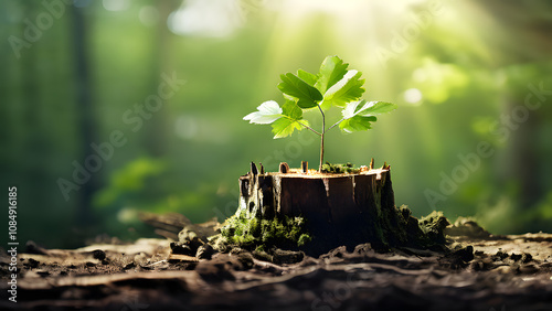 A small green tree is growing out of a stump