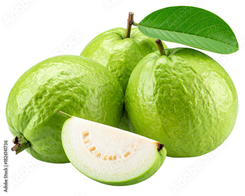 A small group of three guavas arranged artistically—one whole, one sliced, one quarte