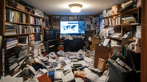 A small investors living room filled with newspapers financial reports and a TV showing breaking news about market crashes.