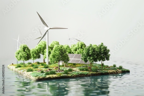 A small island with green trees and wind turbines. The island is surrounded by water. The sky is blue and the sun is shining.