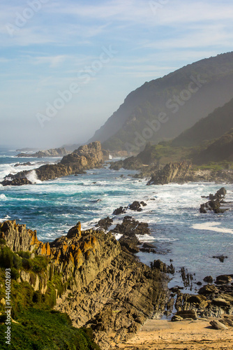 A small sheltered cove, hidden among the tall cliffs and rocks of the Tsitsikamma coastline, along the southern South African coast.