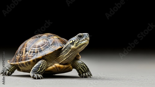 A small turtle with a brown shell standing on a gray surface