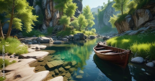 A small wooden boat gently floats on the crystal clear stream near the spring of a secluded monastery , wooden, clear, secluded
