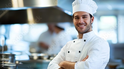 A smiling chef in a white uniform standing in a professional kitchen with other chefs in the background.