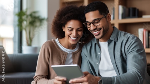A smiling couple holding hands and looking at a financial plan on a tablet
