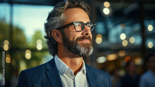 A smiling mature businessman professional executive manager looking away thinking working on tech device.