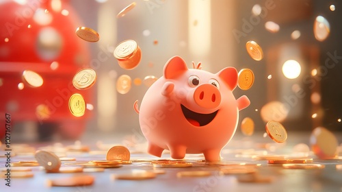 A Smiling Pink Piggy Bank Surrounded by Falling Gold Coins